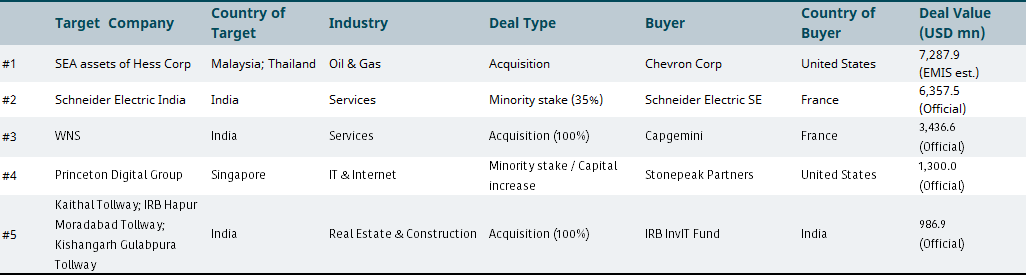 The largest deal in Emerging Asia involves the Southeast Asian assets of Hess, which EMIS estimates to be worth USD 7.3bn. These assets include a 50% participating interest in both Block A-18 of the Malaysia-Thailand Joint Development Area (MTJDA) and the North Malay Basin (Block PM302). Shortly after completing its acquisition of Hess, Chevron sold its stake in Block A-18 to the Thai petroleum company, PTT Exploration and Production, for a consideration of USD 450mn.