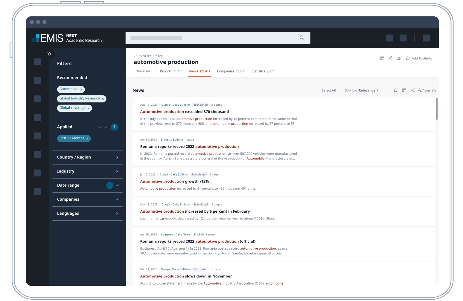 Monitoruj rozwój sytuacji na rynkach wschodzących dzięki ogromnemu repozytorium wiadomości i danych z wielu krajów.