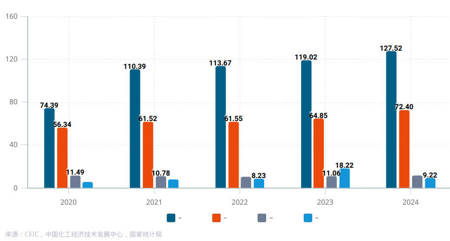 基础化学原料生产是中国化工行业中最大的子行业。近年来,在快速工业化的推动下,中国主要基础化学品的产量稳步增长。国际贸易方面,我国对有机化学原料的国内需求超过产能,已成为聚乙烯、乙二醇、对二甲苯和丙烯等产品的全球主要进口国。同时,中国也是全球最大的无机化学品出口国。海关总署的统计显示,2024年我国无机化学品出口额达到252亿美元。